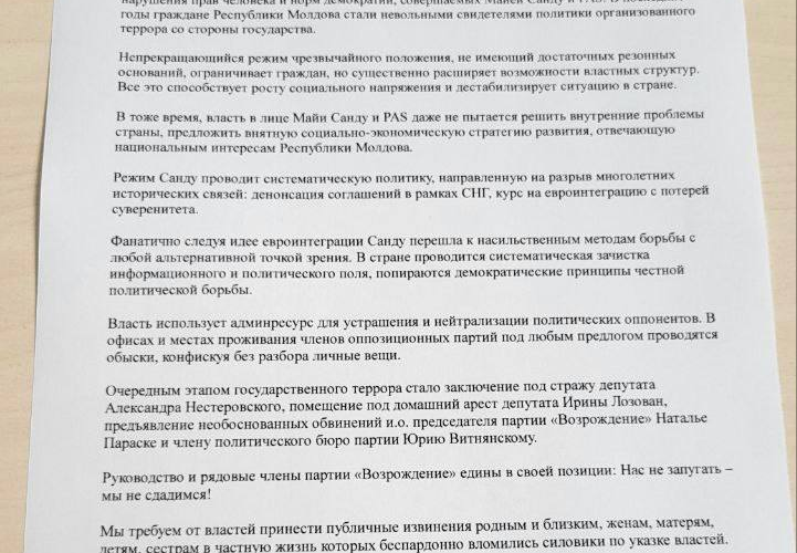 „Aceasta nu este prima noastră solicitare către structurile internaționale. Nu este prima dată când indicăm încălcările drepturilor omului și normele democrației, comise de Maia Sandu și PAS. În ultimii ani, cetățenii Republicii Moldova au devenit martorii involuntari ai unei politici de teroare organizată din partea statului.
