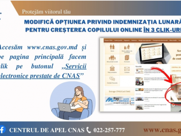 Casa Națională de Asigurări Sociale reamintește tuturor cetățenilor despre serviciul electronic „e-Cerere Indemnizații”, disponibil pe portalul guvernamental unic al serviciilor publice (www.servicii.gov.md) sau pe pagina-web a Casei Naţionale de Asigurări Sociale (www.cnas.md), la compartimentul ”Servicii electronice prestate de CNAS”, cu aju...
